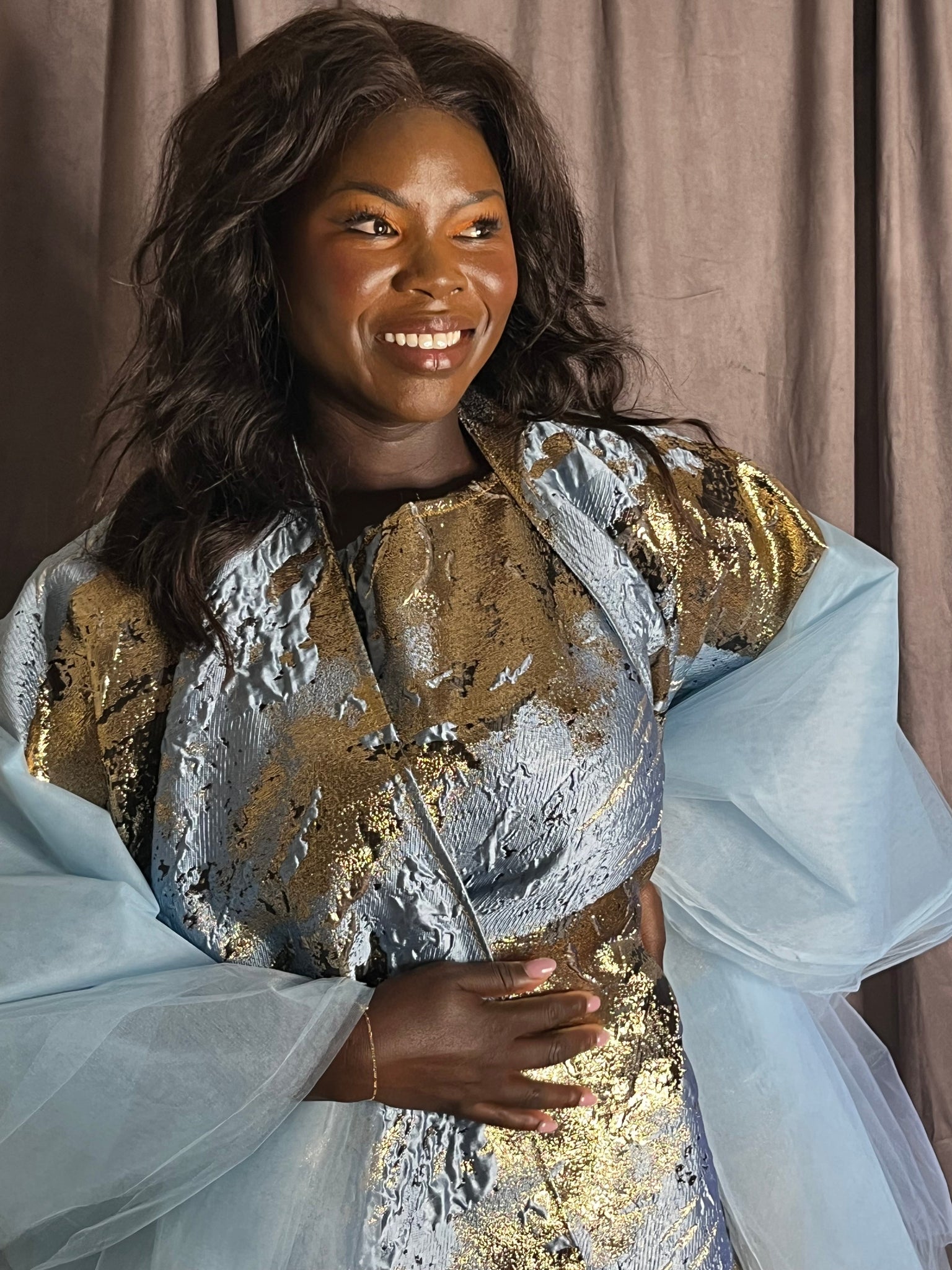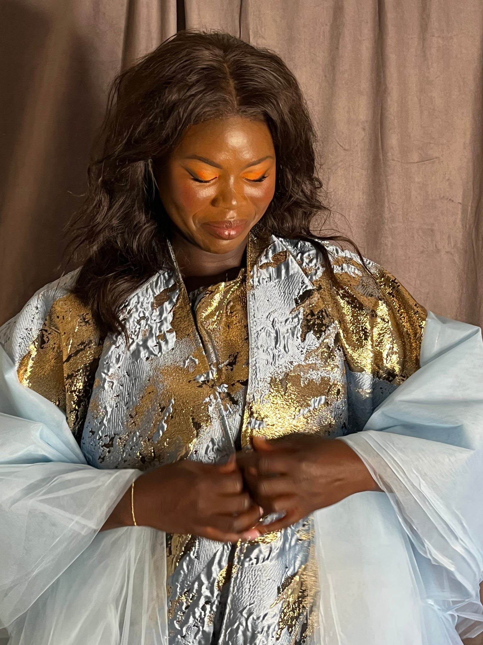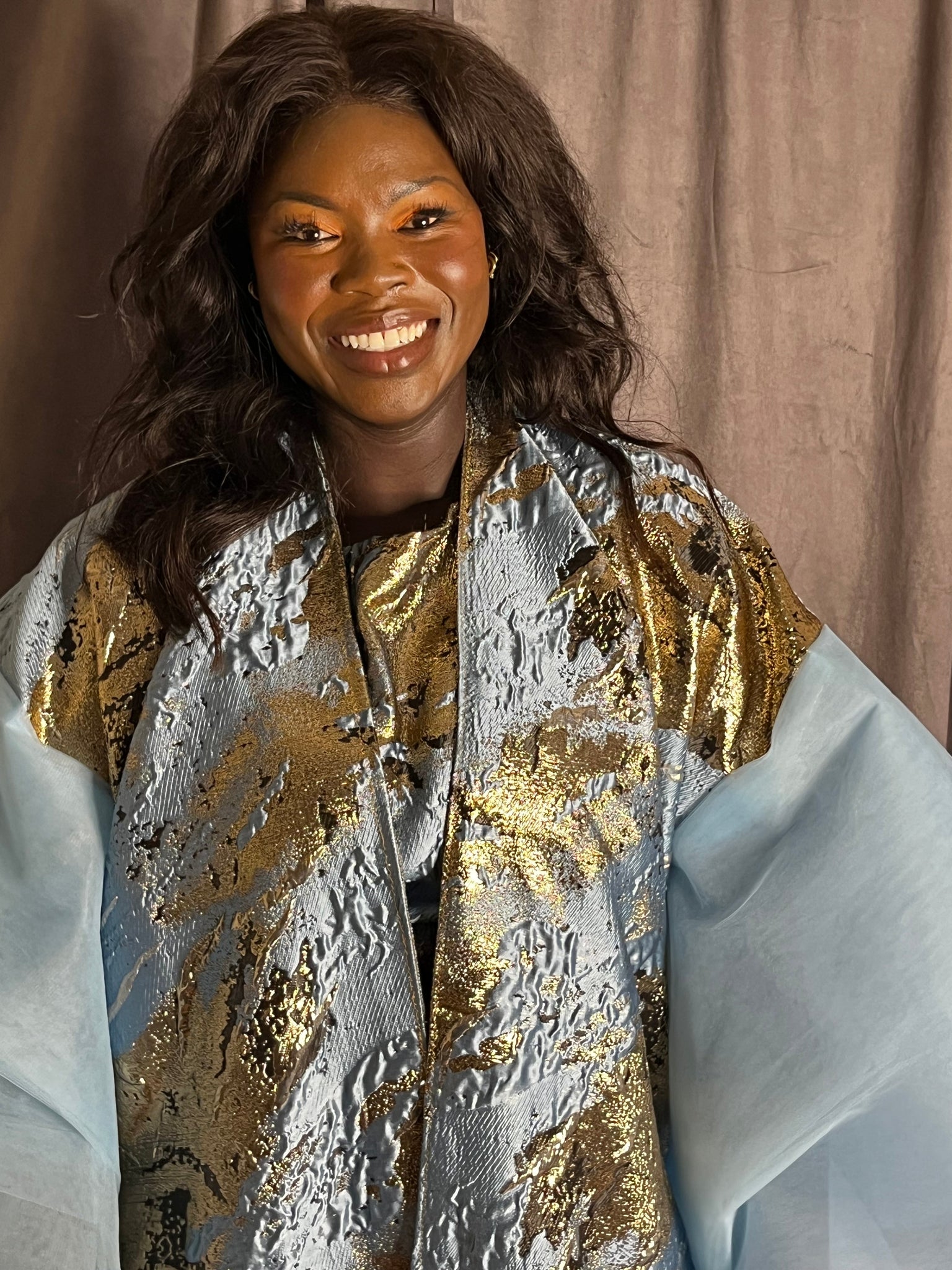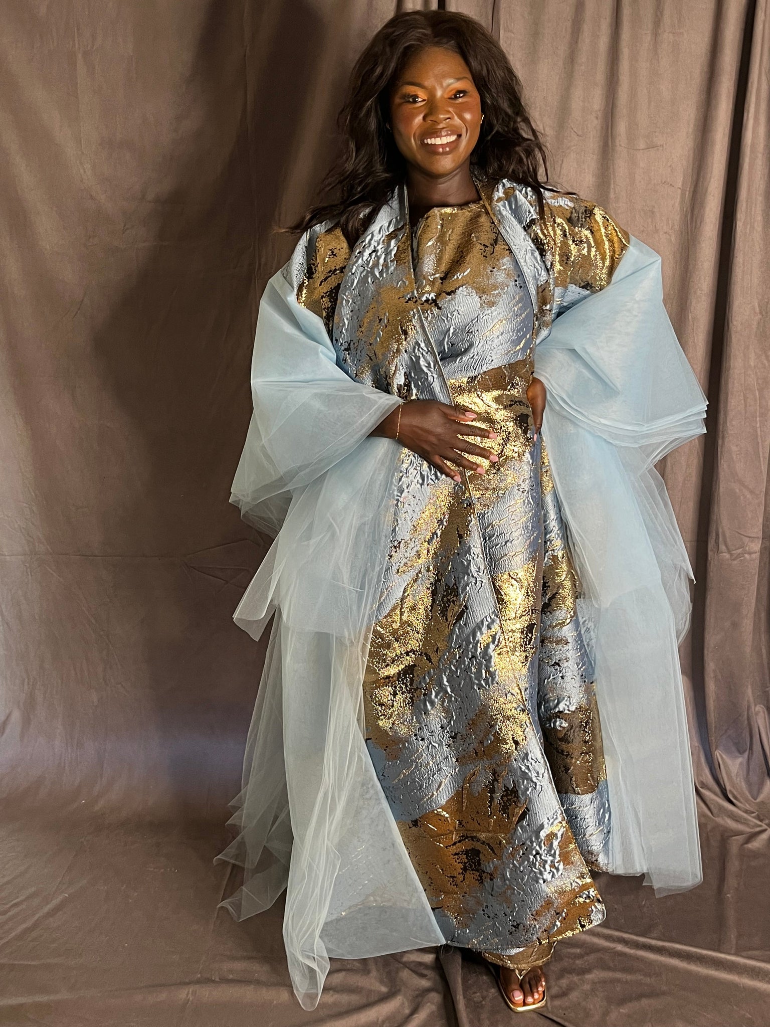 Baby blue and metalic gold long vest finished off with layers of French tulle, for added drama.
